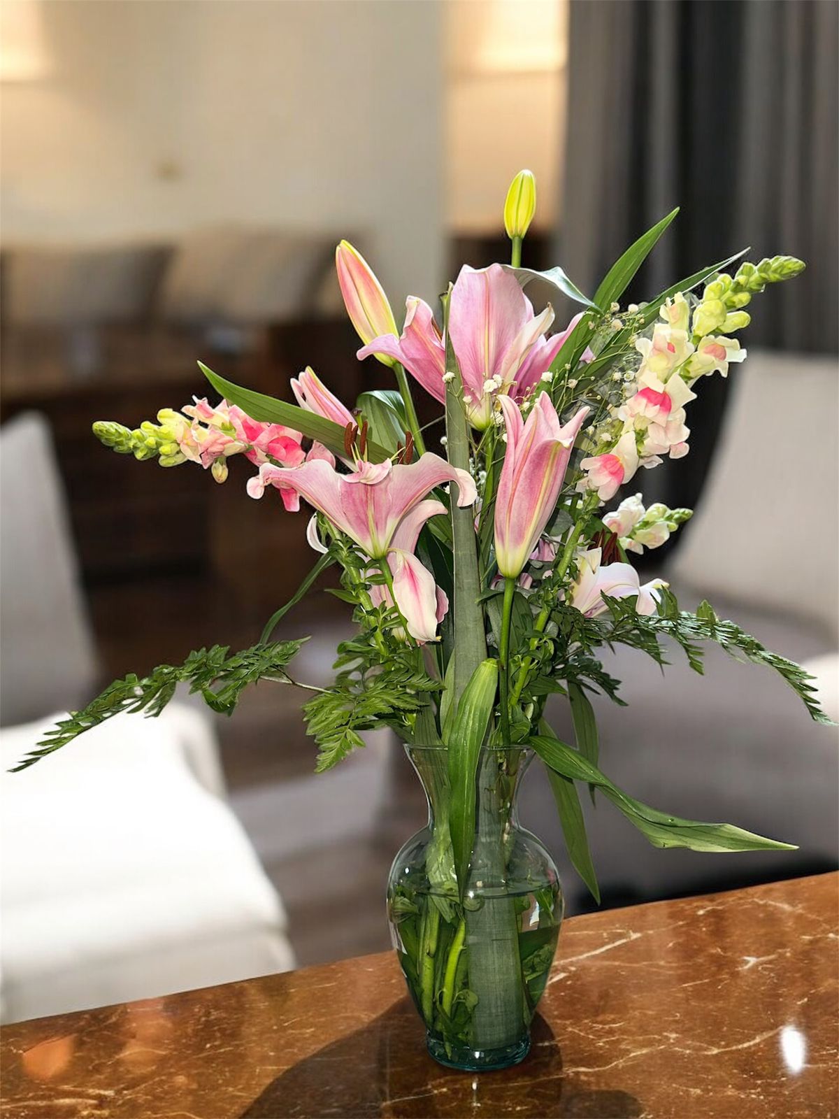 Arreglo en jarrón de vidrio, tiene mayor tendencia para fechas especiales como cumpleaños, aniversarios o simplemente para una persona especial.